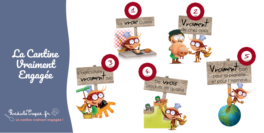 Tout cela peut aussi s’apprendre à la cantine. En tous cas, avec Restoria, c’est ce que Radis la toque a décidé de transmettre aux enfants ! Et pour ça, il suffit de ne pas oublier les 5 piliers durables :