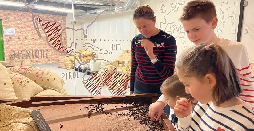 Accompagnés de celle que les kidi-reporters appellent désormais Sam et d'un guide, l'équipage pousse la porte en forme de tablette de chocolat du parcours de découverte. Aussitôt saisis par la douce odeur de chocolat qui y règne, petits et grands se frottent les mains et se lèchent les babines !
